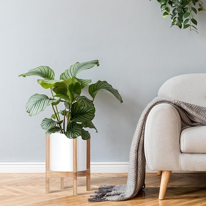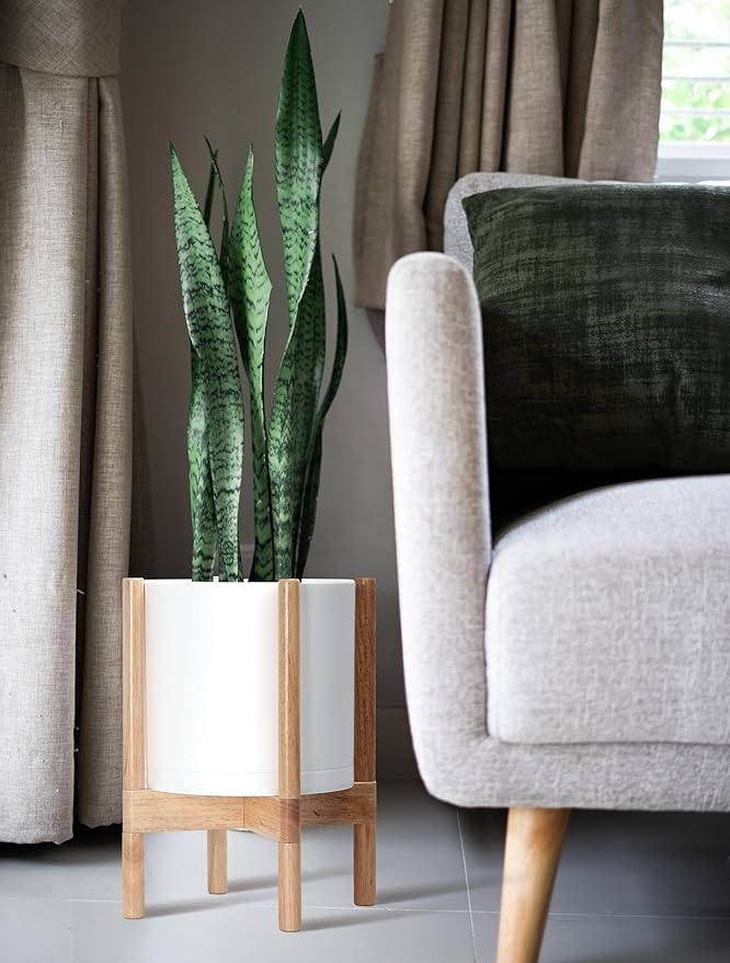• A Complete Set: Minimalist plastic planter, combined with a sculptural, solid wood stand that match perfectly together and looks great in any home.