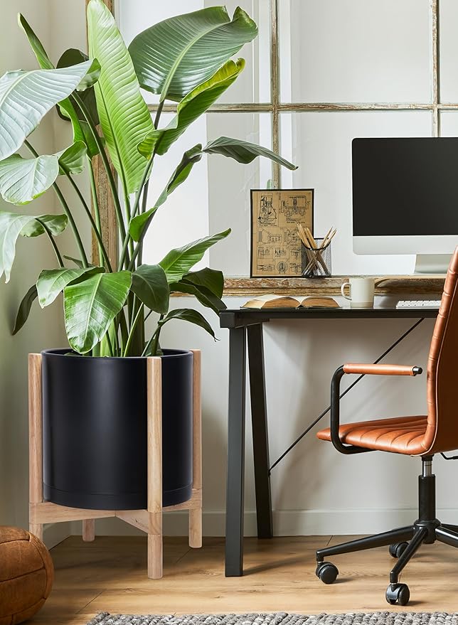 D'vine Dev Planter Pot with Stand - 14 Inch Plastic Cylinder Flower Pot with Wood Planter Holder for Indoor, Matte Black Pot + Natural Stand, 55-C-S-2