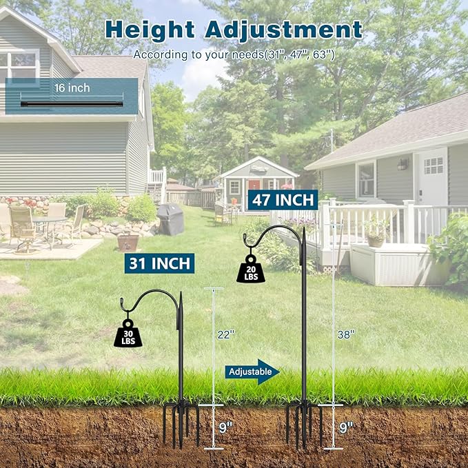 • 【HIGH QUALITY & ADJUSTABLE】 The height of the shepards hooks for outdoor is 47 inch. Our garden hook is made of high quality iron, the black coating on the surface is rust resistant. The height of the shepherds hook for bird feeder can be adjusted by adding or reducing the pole sections, each pole section is 16 inch. So you can adjust the height to 31 inch.