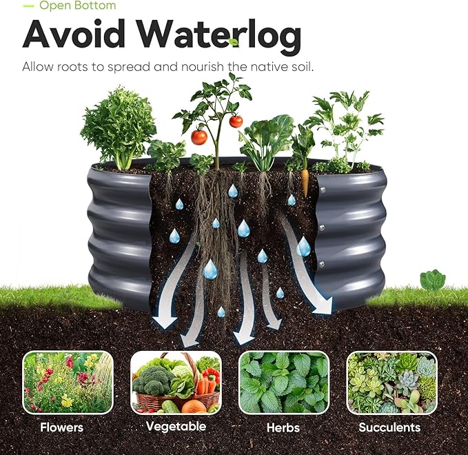 • 【Rolled Edge Design, Open Bottom】The rolled edges of the iron sheets prevent cuts during installation or planting, making it safe to use around pets and children. The open base design prevents water accumulation and rot, allowing roots to breathe better and providing a healthy environment for plant roots.