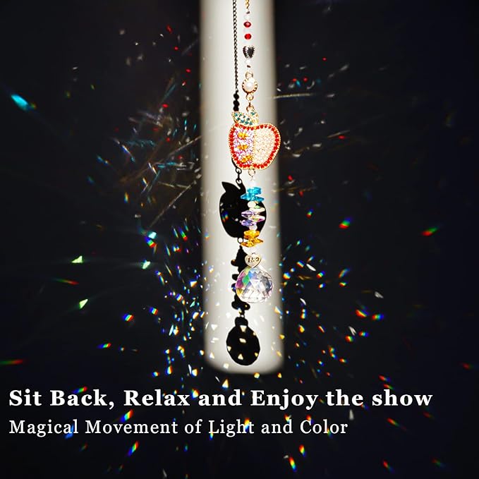 • Handmade Suncatcher: Our innovative designs consist of studded colored rhinestone apples, rainbow prisms and hanging chains. Each crystal suncatcher hangs from a delicate gold chain that casts specks and rainbows across your wall as it sways