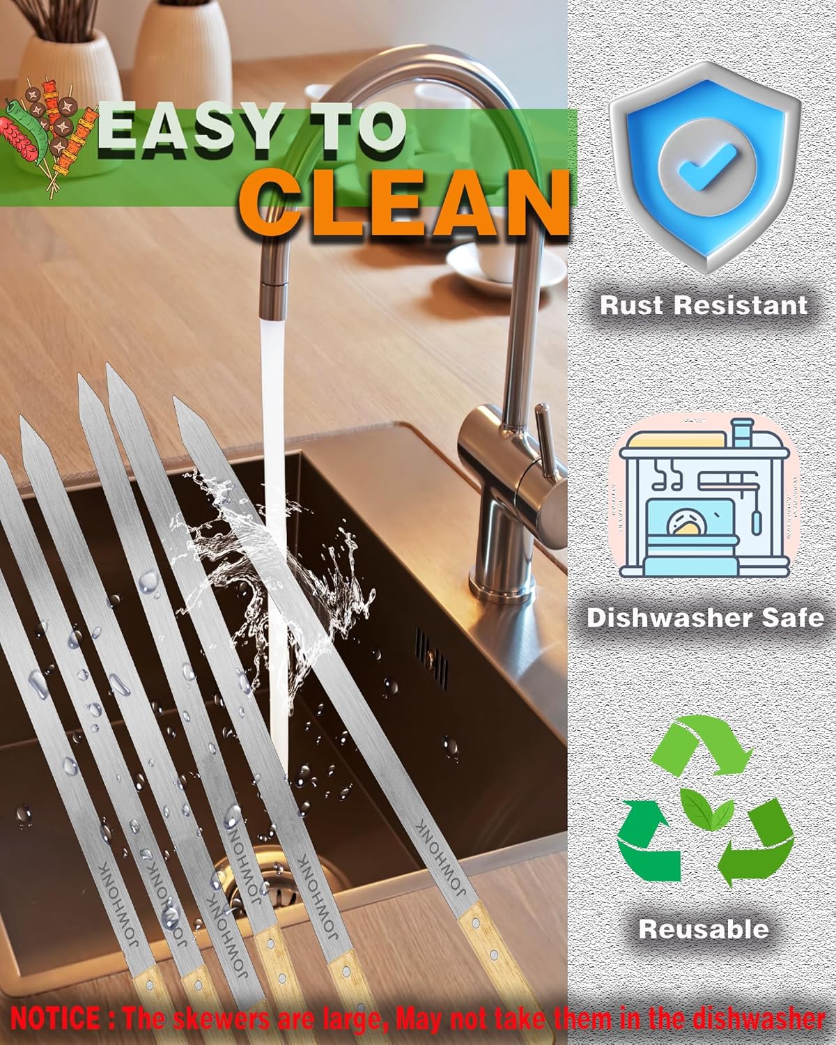 • 【FOOD GRADE 304 STAINLESS STEEL】JOWHONK heavy-duty skewers for grilling are 23.5 inch long,1 inch wide,0.07 in thickness. Our wooden handle flat metal skewers for kabobs are made of premium 304 stainless steel, Ensuring non-rust long time durability, Heat resistant and non-poisonous,Harder than other stainless steel and iron. It's safety for children.Our 304 stainless steel barbecue skewers are reusable. The BBQ kabob skewers surface is smooth that grilled food residue won't get stuck onto the kabob skewer blade.