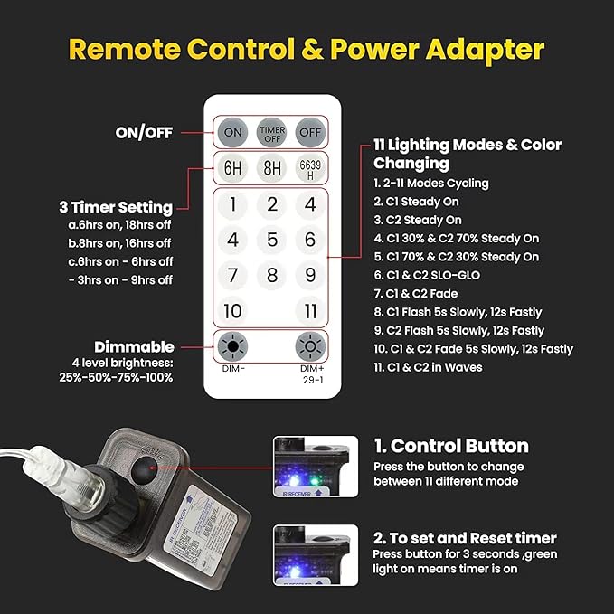 • 4 in 1 Color Changing String Lights: Plug in String Lights can switch freely between Warm White and Multicolor, 200 LED 115ft(98.6ft String Lights,16.4ft Lead Wire), You would like the multiple display options and being able to have either all warm white, all color, or both together.
