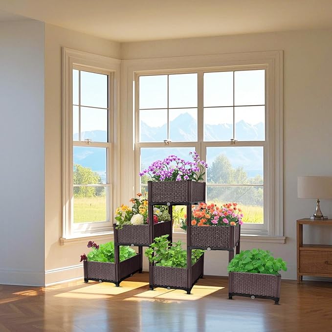• Durable Structure: Made of reinforced plastic in rattan style, it’s lightweight yet sturdy for long-term use indoors or outdoors. The triangular setup gives the elevated garden bed great stability.