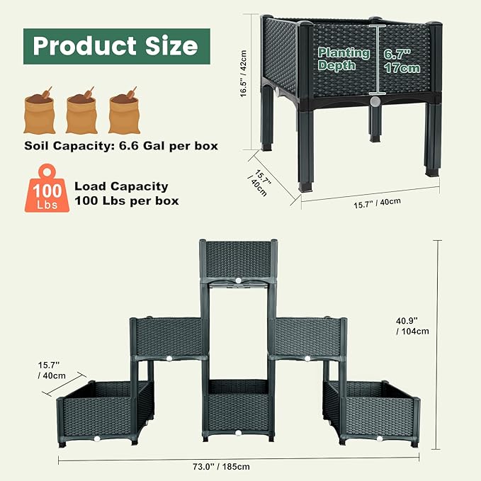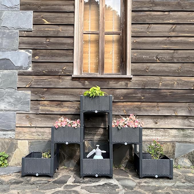 • Durable Structure: Made of reinforced plastic in rattan style, it’s lightweight yet sturdy for long-term use indoors or outdoors. The triangular setup gives the elevated garden bed great stability.