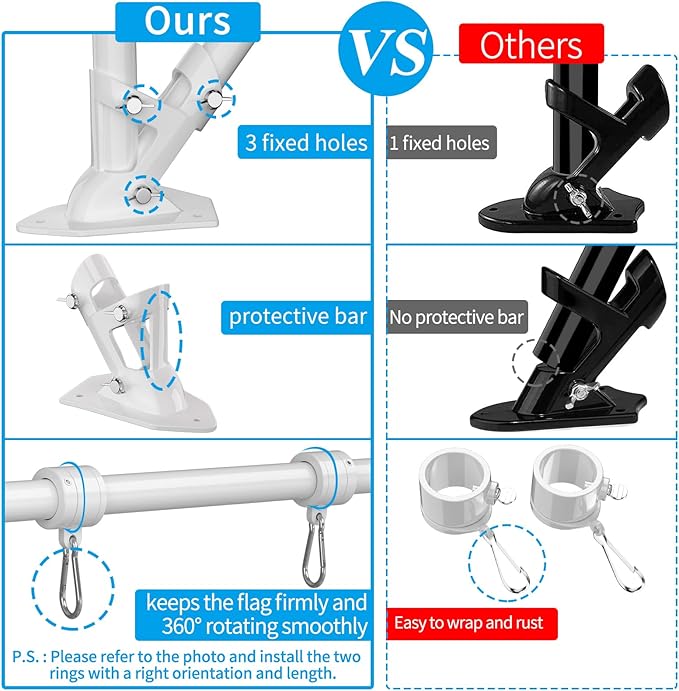• Upgraded Bracket and Tangle Free Rings: The high strength aluminum alloy flag pole holder has unique protective bar and 3 fixed holes to make the two-position (90° and 45°) flag pole more stable. The two new designed flag rings and two sturdy carabiners, which could make the flag tangle-free in the wind. And Adjustable length swivel flag pole kit can be installed according to the different size flags.