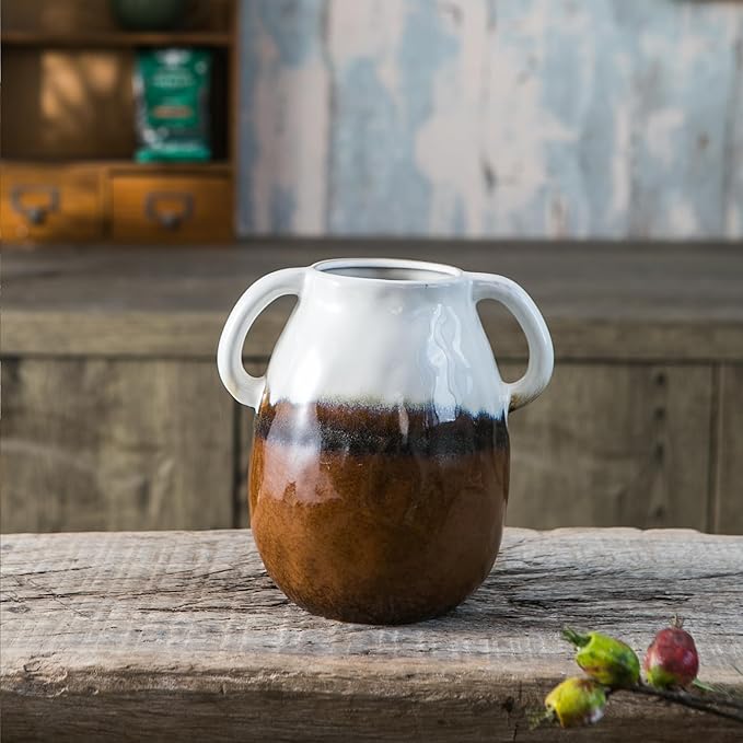 Multi Gradient Ceramic Vase with 2 Handles, Modern Farmhouse Decor, Rustic Terracotta Pottery, Decorative Flower Vases, Clay Small Vase, Centerpiece for Dining Table - 7 Inch Tall