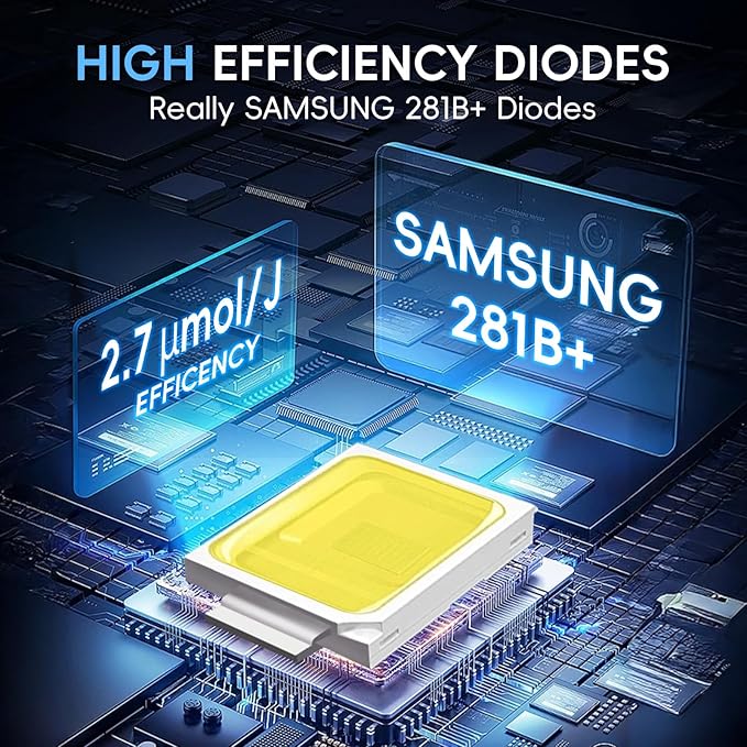 • 120W / with SAMSUNG LM218B+ DIODES(512Pcs):URBZUE's plant grow lights full spectrum 100% uses with SAMSUNG diodes, offering not only high-efficiency spectrum output, long lifespan, and energy efficiency, but also environmental friendliness and minimal color temperature shift.
