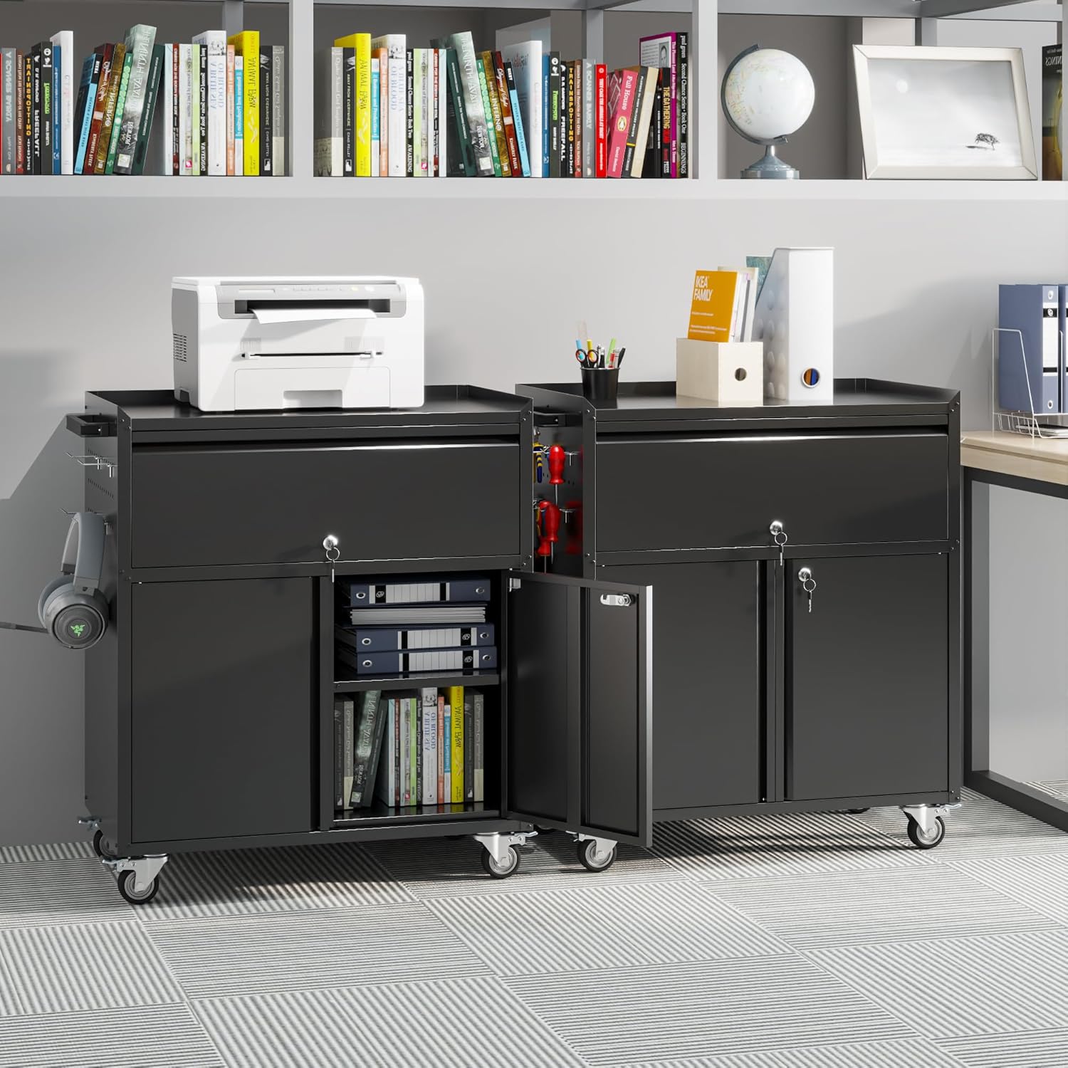 • 【Adjustable Shelves】This metal storage cabinet with wheels and one adjustable shelf and 1 drawer. The shelf can be moved guaranteeing maximum adaptability and convenience for your unique storage and organizing needs.