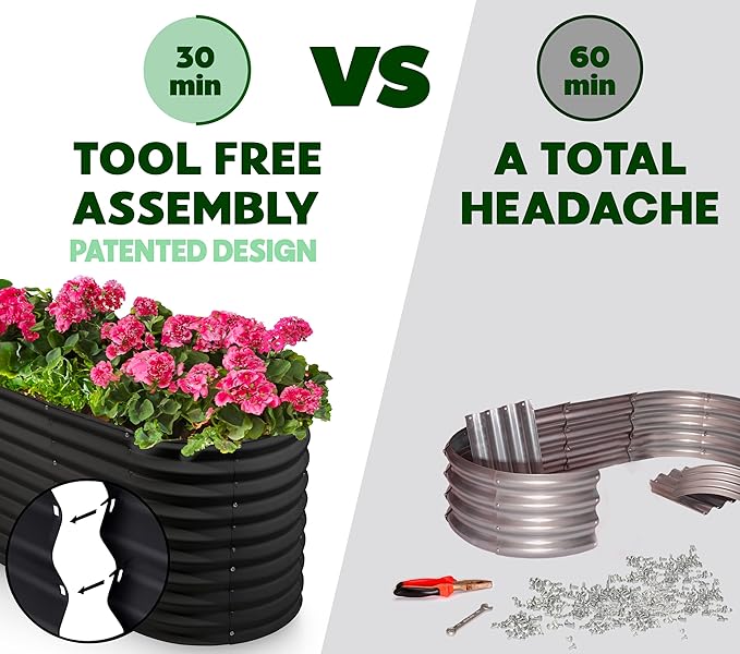 • EFFORTLESS ASSEMBLY, LIKE NO OTHER! Begin your planting journey by choosing our innovative patented design, featuring the perfect combination of easy assembly and durability. Thanks to our unique tool-free design, assembly is a breeze and can be completed in just 30 minutes! Get started on your garden right away and enjoy fresh, healthy produce in no time.