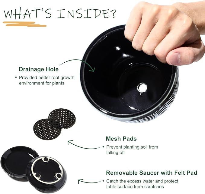 • Ceramic Plant Pots with Drainage Hole: Each small plant pot measures 3.5''W*2.8''H , which is the ideal for growing small and medium sized plants, such as succulents, snake plants, cactus, orchid and small flower. The flower pots has a central drainage hole and saucer to ensure adequate drainage and ventilation to avoid root rot, and include a 1.7 inch diameter mesh to prevent soil from falling out