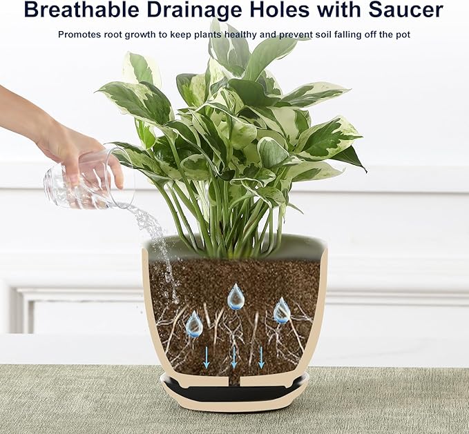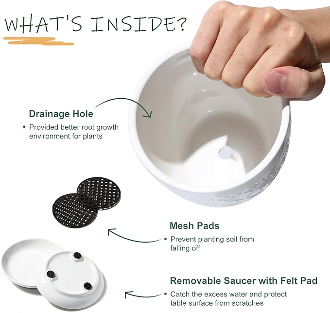 • Ceramic Plant Pots with Drainage Hole: Each small plant pot measures 4.7’’W*3.7’’H , which is the ideal for growing small and medium sized plants, such as succulents, snake plants, cactus, orchid and small flower. The flower pots has a central drainage hole and saucer to ensure adequate drainage and ventilation to avoid root rot, and include a 1.7 inch diameter mesh to prevent soil from falling out