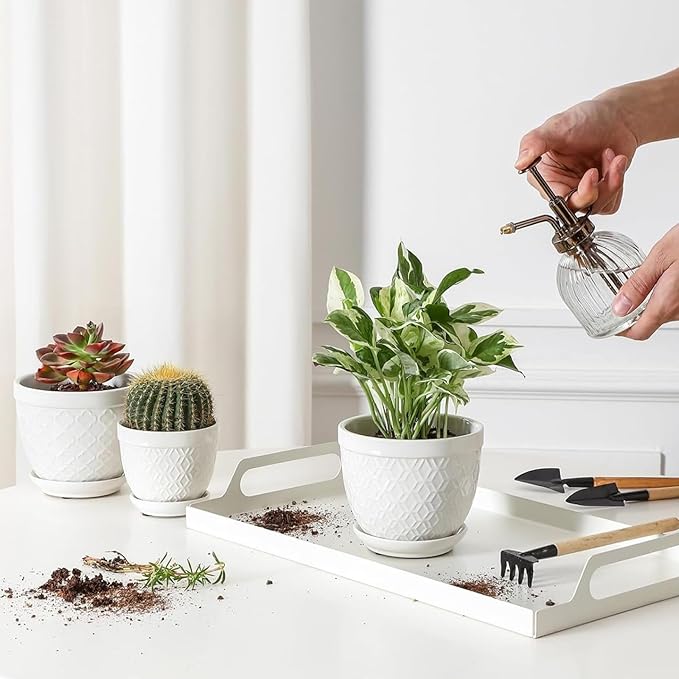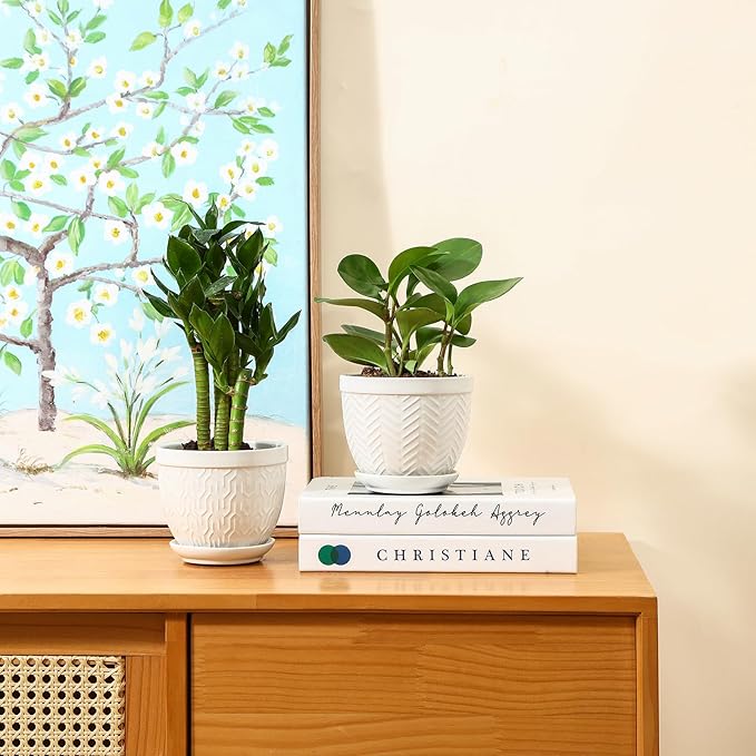 • Minimalist Design of Houseplant Pot: These indoor planters are designed with four different embossed patterns that make it easy to mix and match plants to create a elegant look, decorating windowsill, tabletop, shelve, kitchen, living room, bedroom, office, garden and patio. These flowerpots have a minimalist design and combination solid color glaze that blend seamlessly with a various of home styles