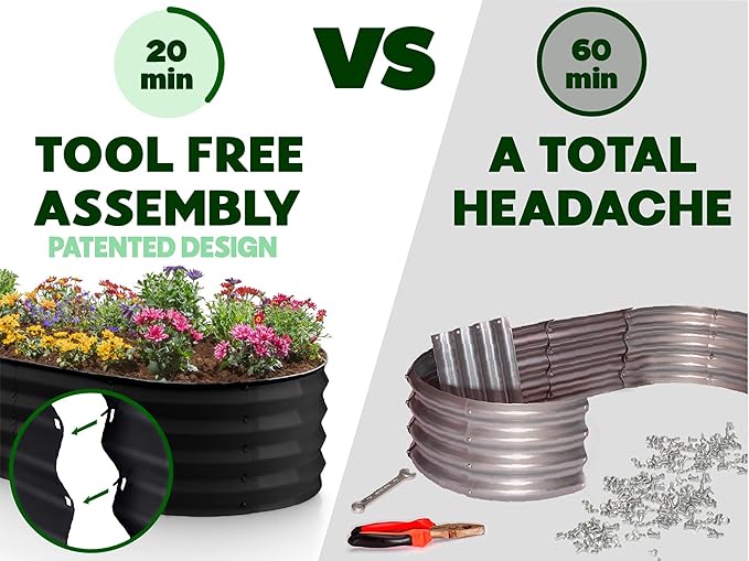 • EFFORTLESS ASSEMBLY, LIKE NO OTHER! Begin your planting journey by choosing our innovative patent-pending design, featuring the perfect combination of easy assembly and durability. Thanks to our unique tool-free design, assembly is a breeze and can be completed in just 20 minutes! Get started on your garden right away and enjoy fresh, healthy produce in no time.