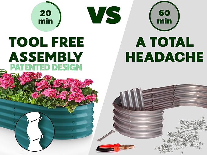 • EFFORTLESS ASSEMBLY, LIKE NO OTHER! Begin your planting journey by choosing our innovative patented design, featuring the perfect combination of easy assembly and durability. Thanks to our unique tool-free design, assembly is a breeze and can be completed in just 20 minutes! Get started on your garden right away and enjoy fresh, healthy produce in no time.