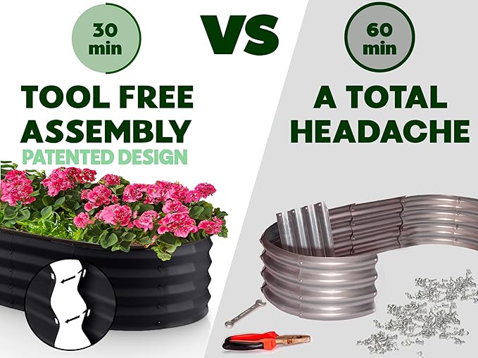 • EFFORTLESS ASSEMBLY, LIKE NO OTHER! Begin your planting journey by choosing our innovative patented design, featuring the perfect combination of easy assembly and durability. Thanks to our unique tool-free design, assembly is a breeze and can be completed in just 30 minutes! Get started on your garden right away and enjoy fresh, healthy produce in no time.