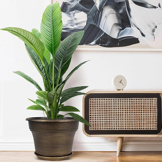 • 【TRADITIONAL DESIGN】Plastic planters for indoor plants with trays are designed in dark gold colors & a classic round look, which allow this pot to fit into any indoor & outdoor setting. With these golded flower pots, it could adds fresh, decorative flair to your home. Decorate your windowsill, desktop, shelf, bedroom, living room, kitchen, garden, office with our 10 inch plastic plant pot.