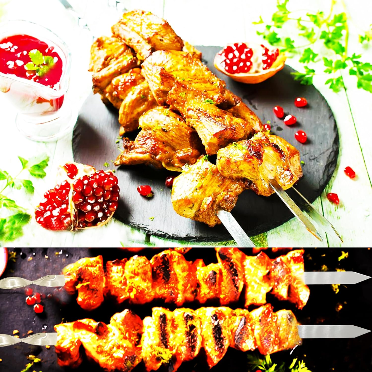 • 【PRECAUTIONS】Stainless steel skewers are very sharp.Becareful when using,Surface of the kebab skewers is well polished and smooth,Just wash them with gentle detergent immediately after used,wipe away the water and keep in dry place with the storage bag after used.