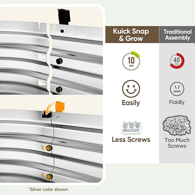 • 【Kuick Snap & Grow】Tired of spending hours bending over to assemble a raised garden bed? Our patented Snap-Lock technology eliminates 75% of screws, allowing you to easily interlock the metal panels like building blocks, so you can assemble it quickly during a coffee break.