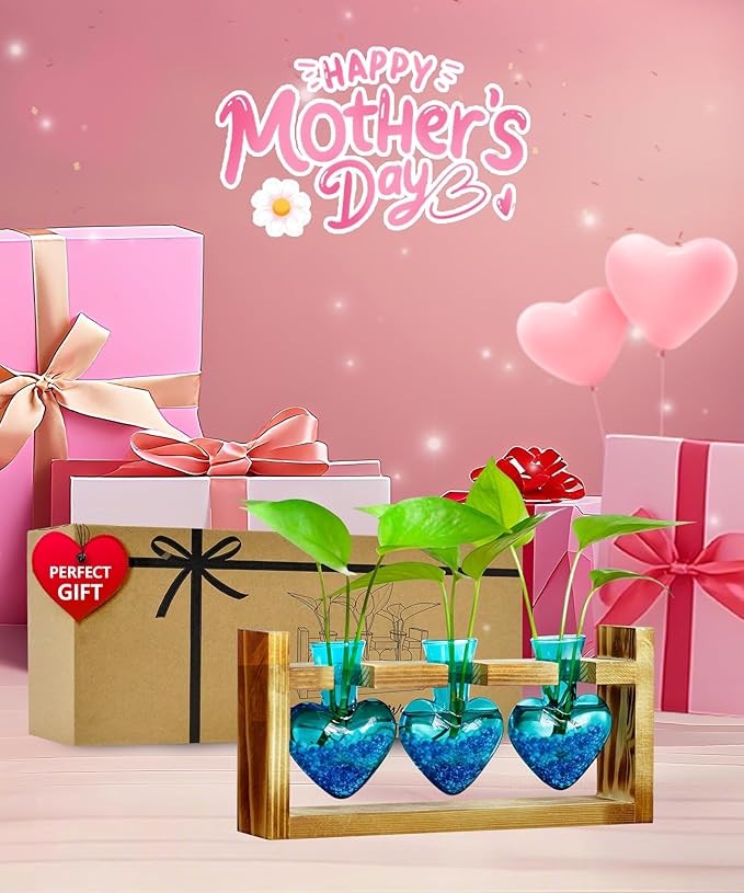 Nacome Plant Terrarium for Office Decor: Wooden Stand Tabletop Planter 3 Bulb Glass Vase Heart Shaped for Hydroponics Indoor Home - Birthday Gifts for Women Mom Grandma