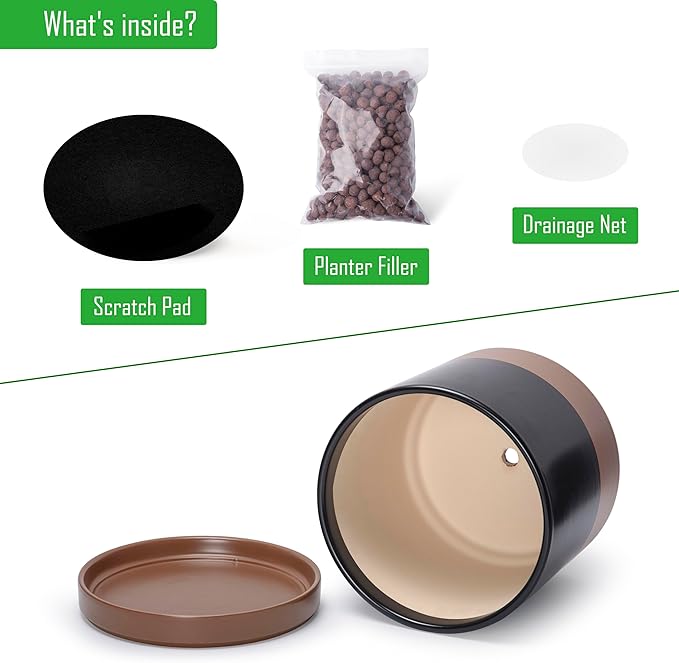 • Planter pot with drainage hole, mesh drainage net and protective scratch pad included.