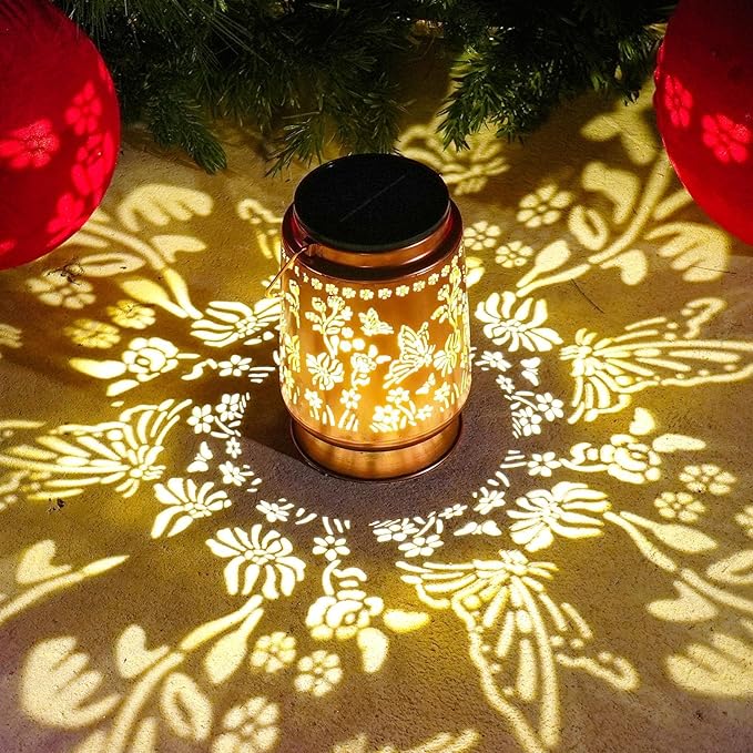 • [Larger Size & Gift Choice]: This hanging solar lantern with outdoor comes in a bigger size lantern: 5.91*5.91*14.57 inches, with howlled butterfly design,suitable not only as outdoor decoration but also as a festive gift for friends and family. With its exquisite design and unique symbolism, it makes an ideal present for Christmas