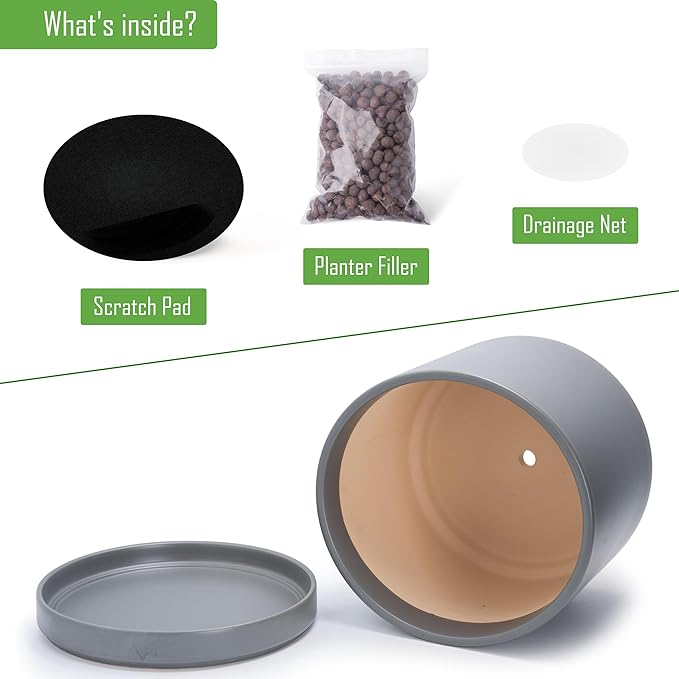 • Planter pot with drainage hole, mesh drainage net and protective scratch pad included.