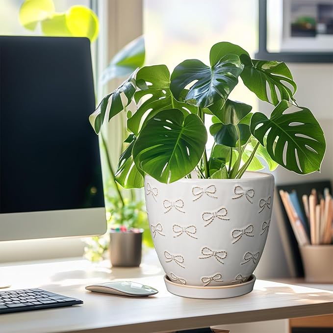 • Stylish Appearance: Our ceramic planter has a white main colour, a beautiful embossed bow tie pattern on the surface, elegant appearance making it ideal for home decor, garden decor and office decor