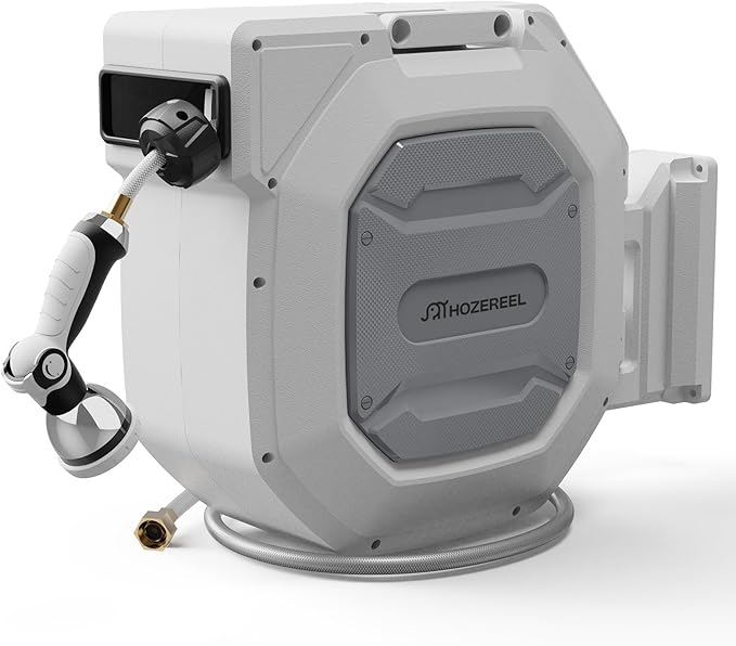 5/8" x 100 ft Heavy Duty Retractable Garden Hose Reel by HOZEREEL, Outdoor Garden Hose Reels - Self Retract Wall Mount Hose Reel Automatic Storage, 10 Pattern Nozzle, Grey