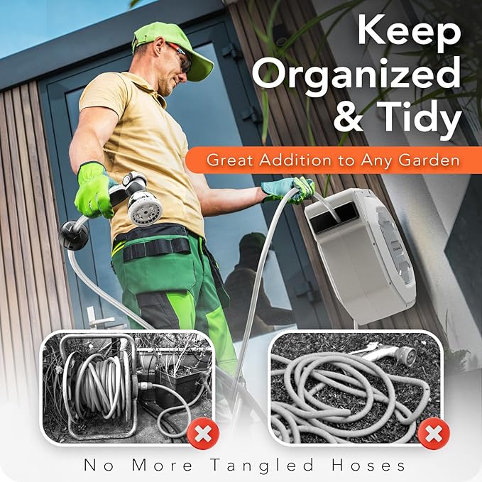 • 【Tidy Looking in Yard】: The guide mechanism in hose reel that shifts from side to side to evenly distribute the hose and keep organized. And the included hoses all have a nice smooth glossy finish that washes off easy after being dragged through garden dirt and mud which makes keeping clean a snap before storing the hose away.