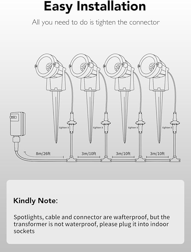 • 4-in-1 Low Voltage Landscape Lighting Kit: This landscape lighting kit includes 4x 6W outdoor spotlights, 1x 36W FCC-Certificated transformer with long cable. The total length of the cable is 17m/56ft (the length between the transformer and the first light is 8m/26ft, the length beetween the light and light is 3m/10ft). All you have to do is conncet the each light to the main cable which is very easy to use.
