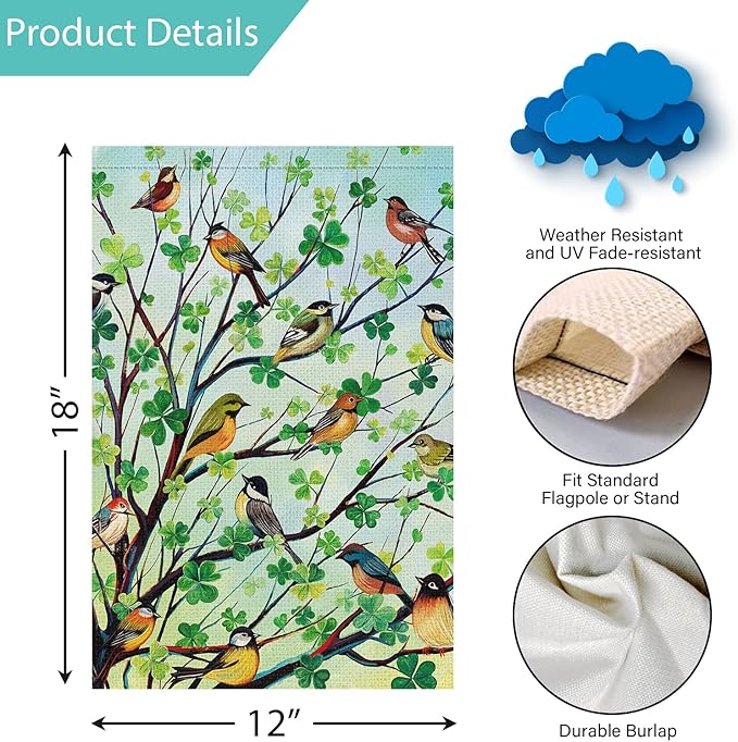 • For St. Patrick's Day Home Garden Decor: Adorned with charming shamrocks and birds pattern, our garden flag adds a festive touch to your outdoor space. It’s perfect for welcoming guests and enhancing your St. Patrick's Day celebrations.