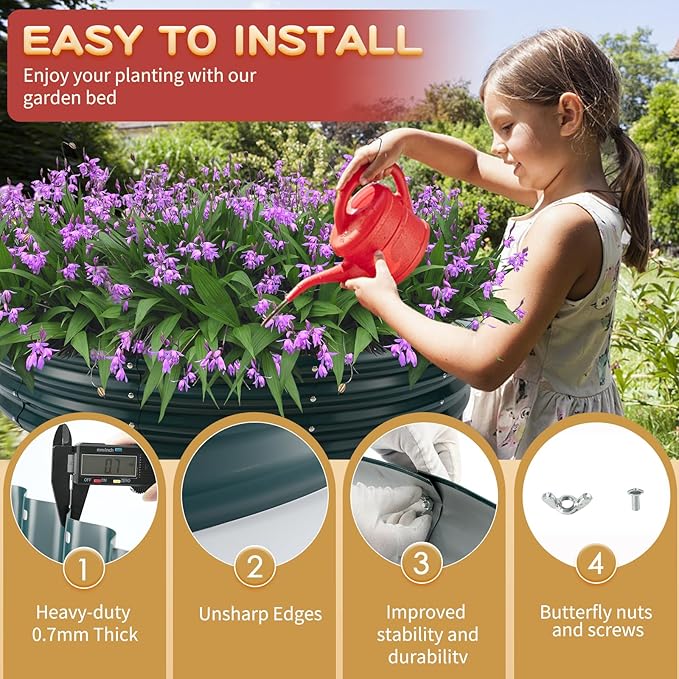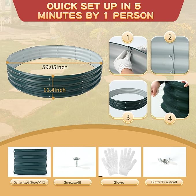 • 【DURABLE & STABLE】: ZBZBML round raised garden bed (5×5×1ft) is 60 IN Diameter,11.8IN Tall, each is made of 0.7MM thick Q195 galvanized metal sheet painted, double-layer anti-corrosion galvanizing and round structure design,it is built to providing a solid foundation for your plants.