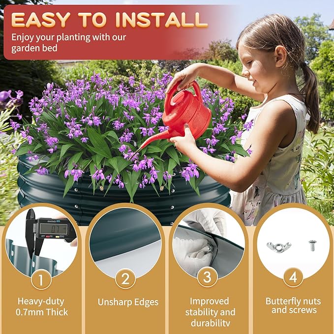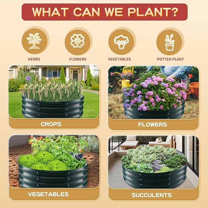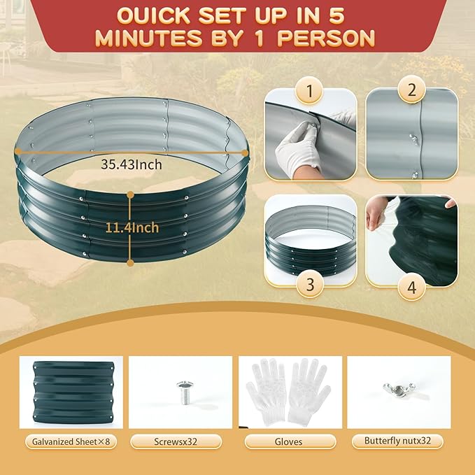 • 【DURABLE & STABLE】: ZBZBML round raised garden bed (3×3×1ft) is 36 IN Diameter,11.8IN Tall, each is made of 0.8MM thick Q195 galvanized metal sheet painted, double-layer anti-corrosion galvanizing and round structure design,it is built to providing a solid foundation for your plants.
