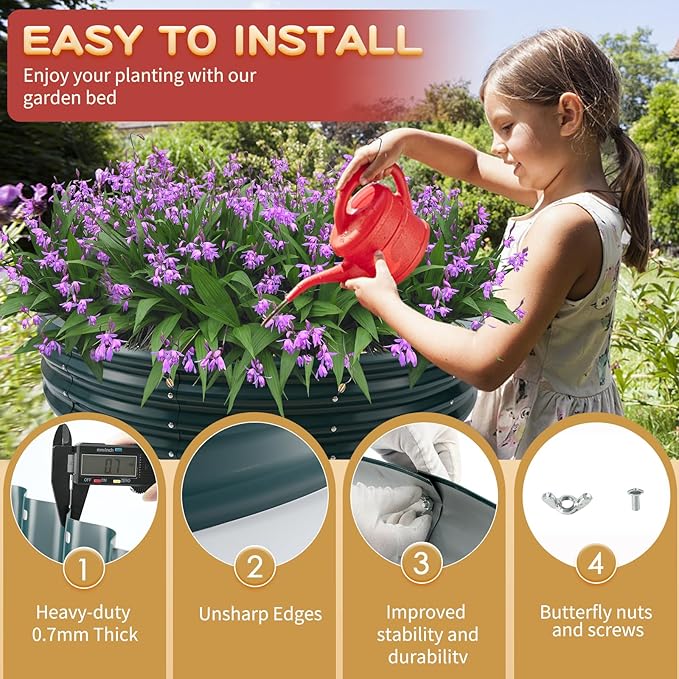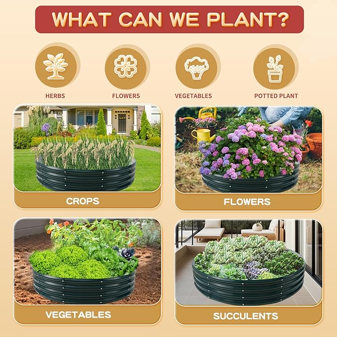 • 【DURABLE & STABLE】: ZBZBML round raised garden bed (4×4×1ft) is 47 IN Diameter,11.8IN Tall, each is made of 0.7MM thick Q195 galvanized metal sheet painted, double-layer anti-corrosion galvanizing and round structure design,it is built to providing a solid foundation for your plants.