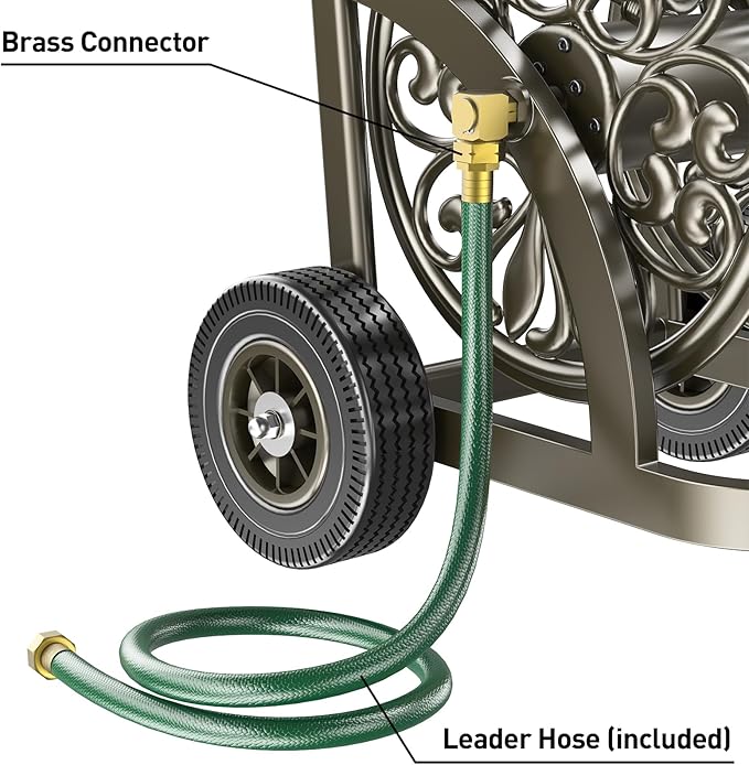 • 【All-weather Construction】Built to withstand all weather, the heavy-duty hose reel cart is constructed with 3 gauge steel, coated with durable powder finish, ensuring the garden hose reel cart has long-lasting performance. The water hose cart is equipped with a solid brass connector, making the garden hose leak-proof.