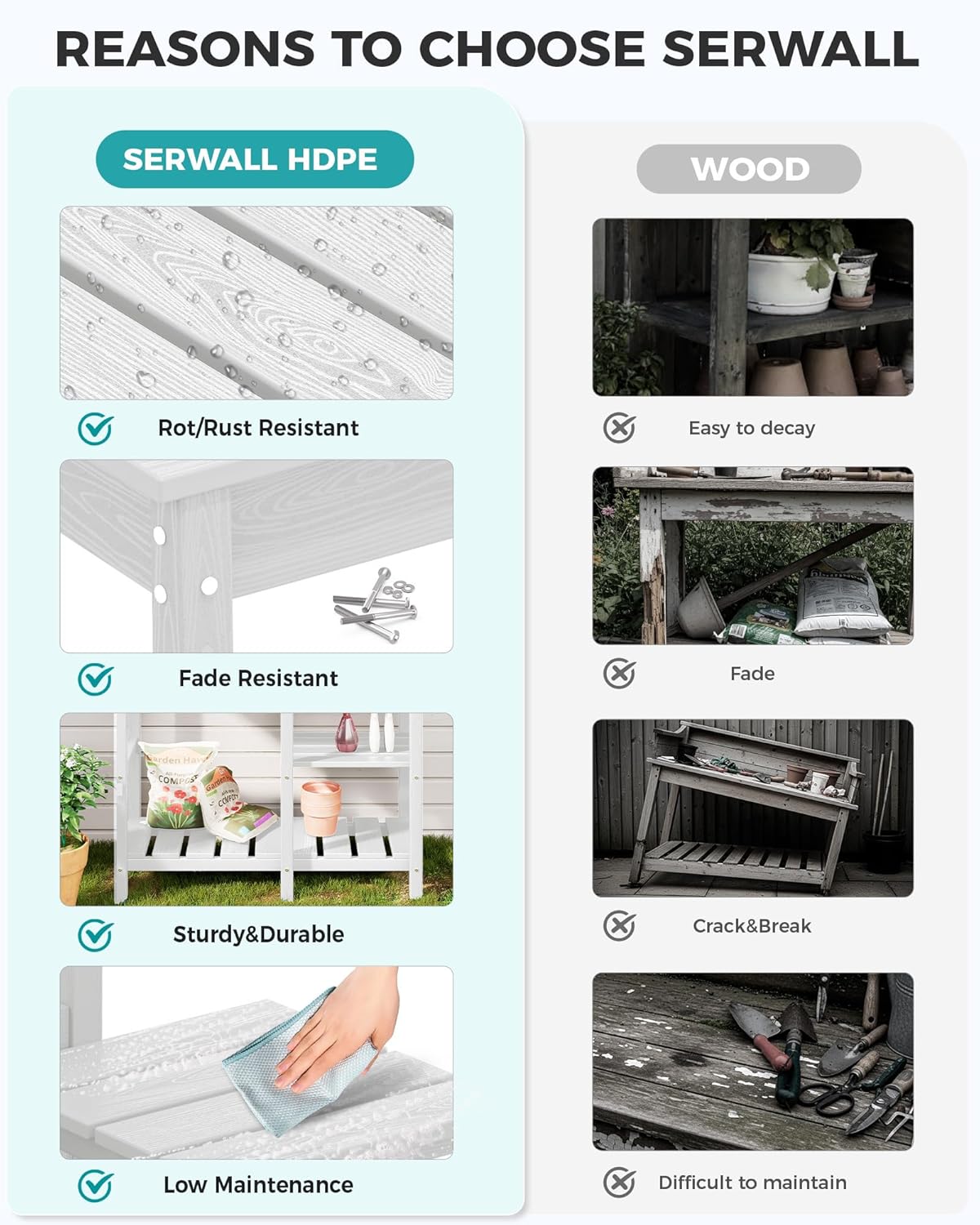 • HDPE Material: Constructed from 100% HDPE material, the SERWALL outdoor potting bench offers high strength and stability, ensuring a long service life. Potting bench table is durable for outdoor use in any weather condition.