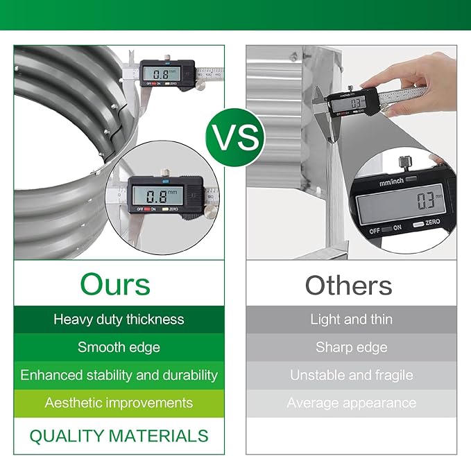 • DURABLE GALVANIZED MATERIAL: Gardmax outdoor raised garden beds are made from 0.8mm heavy-duty galvanized material, ensuring exceptional longevity and durability. It is more resistant to high temperatures and freezes, making it very suitable for outdoor use. And this metal will survive the elements for decades, but when you're ready to replace it, the metal is entirely recyclable. (Moreover, the middle support strip provided exceptional strength to our lightweight Galvanized Raised Garden Bed.)