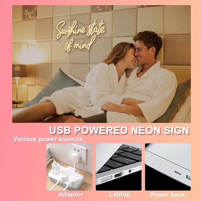 • Adjustable Brightness: Whether creating a romantic dinner atmosphere or a lively party vibe, our Sunshine State of Mind neon sign adds a charming glow to your setting. With its brightness adjustment feature, you can effortlessly control the softness or brightness of the light, making it for any occasion