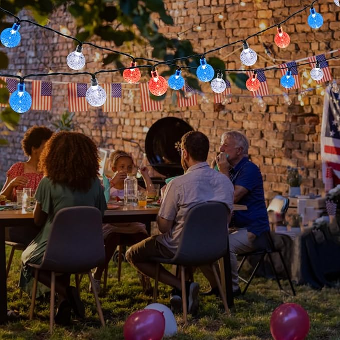 • 2025 Upgrade 4th of July Decorations Lights: The built-in memory chip remembers your last mode setting, eliminating the need for daily resets. Perfect for 4th of July, National Day, Independence Day, Memorial Day, Veterans Day, Presidents Day and other celebrations, these solar globe string lights add a touch of magic to any occasion.