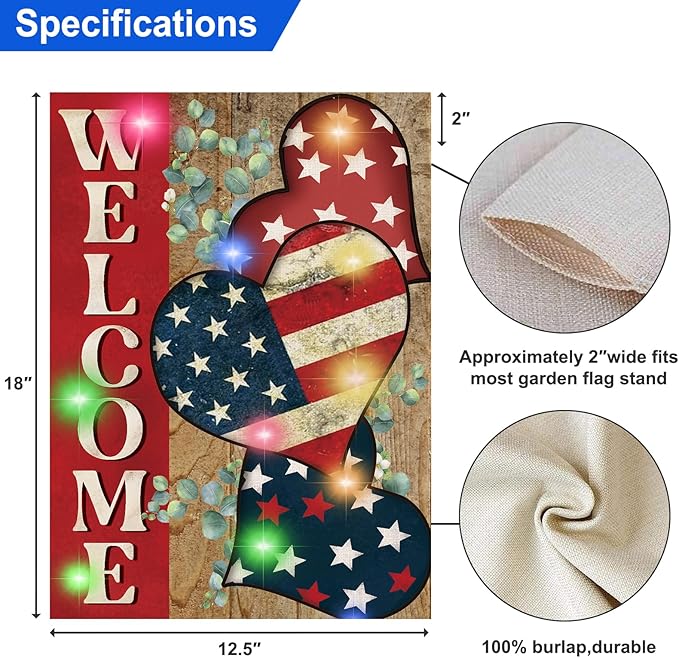 • Seasonal Yard Flag Size: This LED yard flag size is 12 x 18 Inches, available for any deck, patio, porch, or veranda Outdoor Yard house Decorations. With about 2.0 inch wide hanging sleeve, our garden flags 12x18 double-sided are easy to install and fit all standard garden flag poles, flag pole brackets stands and hangers, etc. (stand not included). Make stunning decorative statements for your backyard, lawn, or garden.