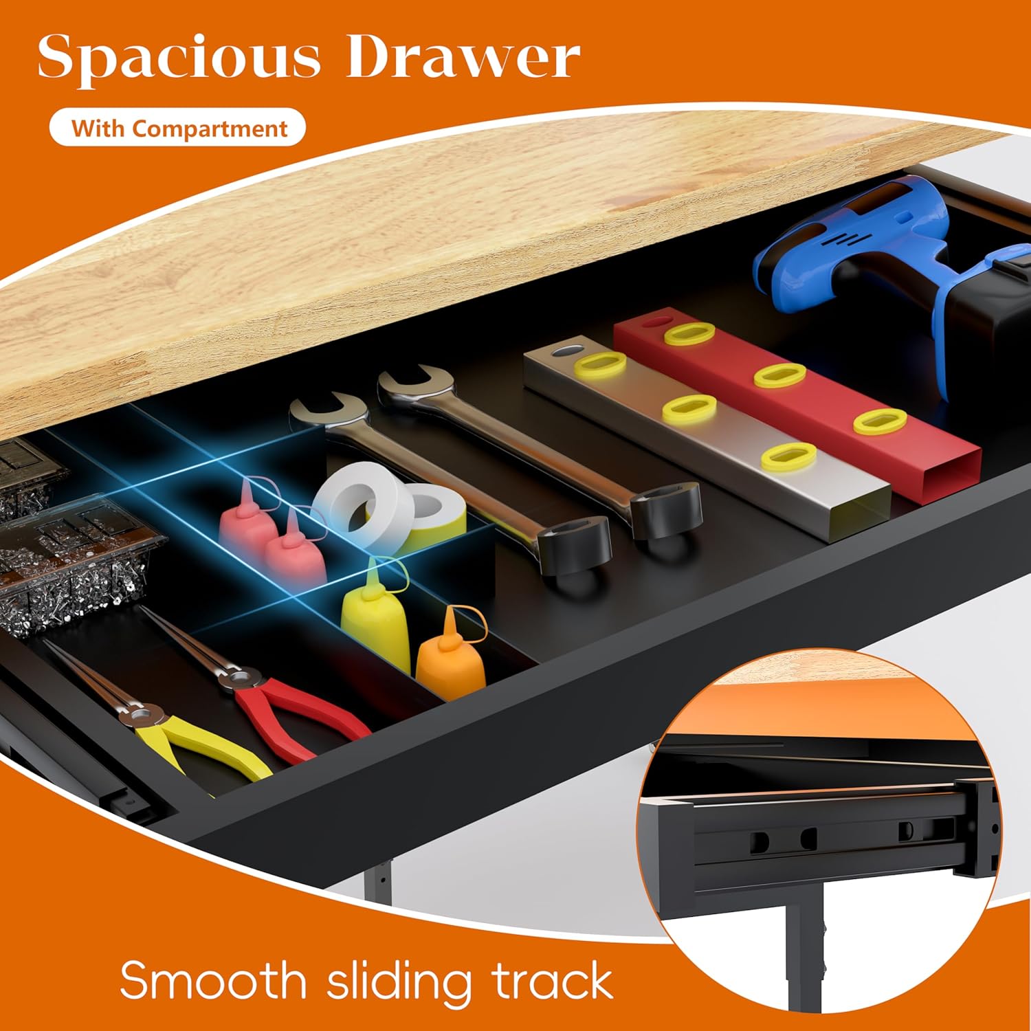 • Heavy Duty Workbench with Drawer: Features a 2" deep drawer with high-quality smooth slides supporting up to 100 lbs. Spacious enough for screwdrivers, wrenches, and small power tools. Includes a removable iron compartment, placeable on the left or right side for flexible storage