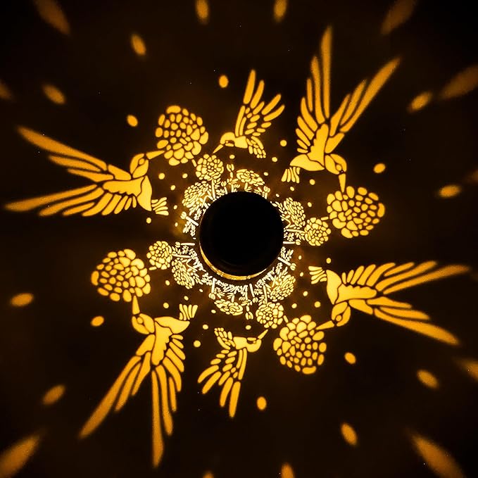 • Charming Solar Garden Lights: Enhance your garden with these stunning hummingbird solar lanterns. Featuring an intricate retro design with a gold-copper finish and hollow metal veneer, they cast warm, inviting light while creating beautiful hummingbird patterns. Perfect for gardens, patios, walkways, and porches, these elegant lanterns blend beauty with functionality, enhancing any outdoor environment with a graceful, atmospheric glow.