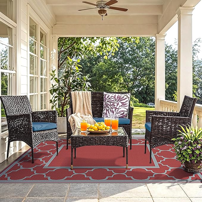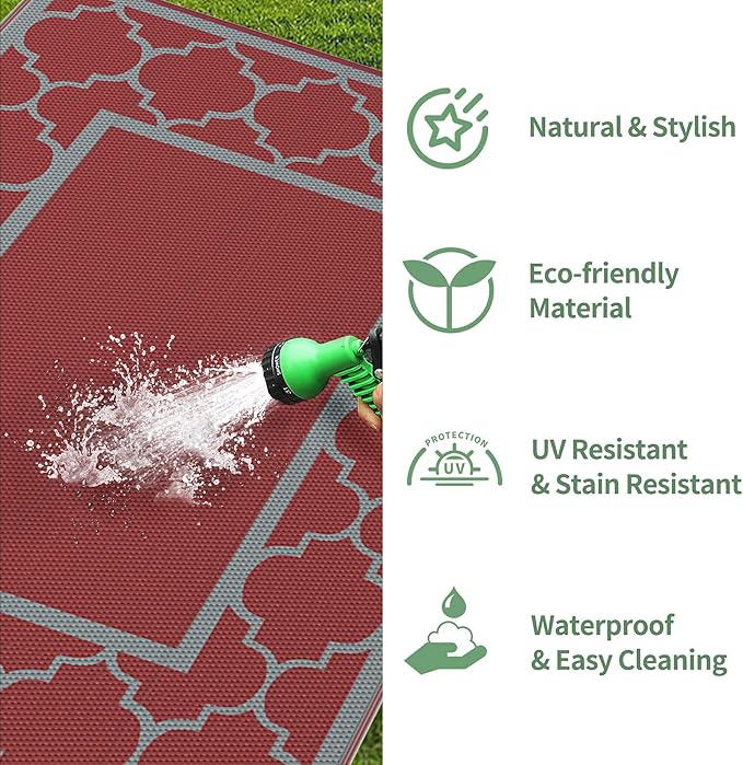• Upgraded Materials & Reversible Use:GENIMO's outdoor plastic straw rug, crafted from recyclable polypropylene, features eye-catching patterns and is fully reversible. Waterproof and durable, it's an ideal choice for patios and outdoor relaxation, especially as part of your camping essentials. Thanks to the upgraded weaving process, whether used on one side or the other, it seamlessly integrates with the outdoor environment, bringing joyful moments.Also perfect as a fall outdoor rug