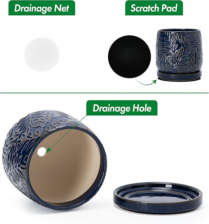 • Drainage Hole and Saucer: Each pot comes with pre-drilled drainage hole and matching ceramic tray to drain excess water.