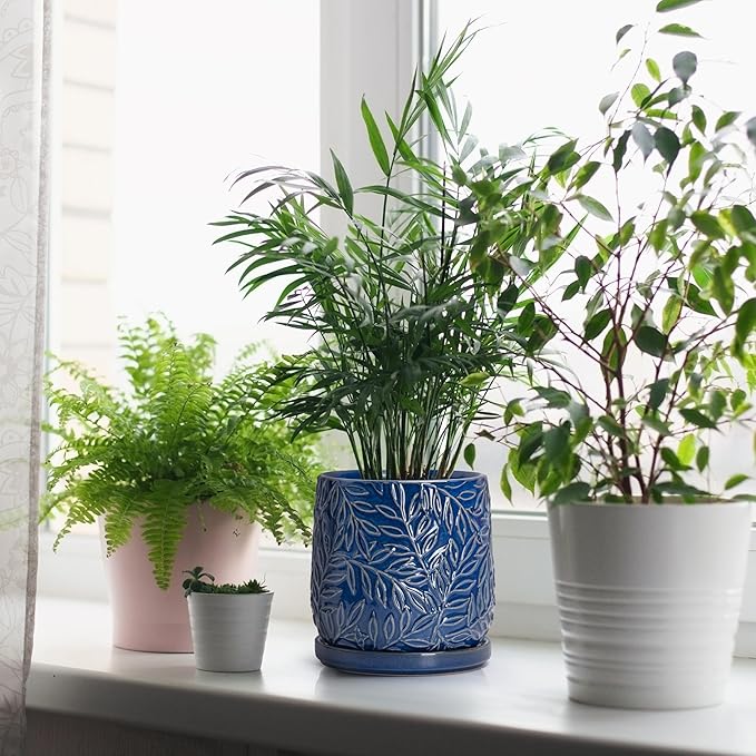 D'vine Dev 6 Inch Embossed Leaves Stoneware Planter Pot with Drainage Hole and Saucer, Midnight Blue, 27-A-X-3
