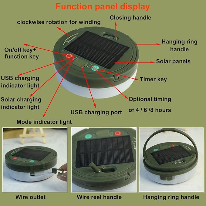 • ⭐【Timer Function and Swivel Base】Retractable camping string lights can be set the auto timer for 4/6/8 Hours by the time switch key. Swith light and light mode button can adjust the brightness and change to the 10 lighting modes like steady on, breathing blinking, SOS flashing, etc. The swivel base of the light helps you to quickly put away the light string, and our solar string lights is sturdy and durable, can be bent and twisted at will and not easy to tear.