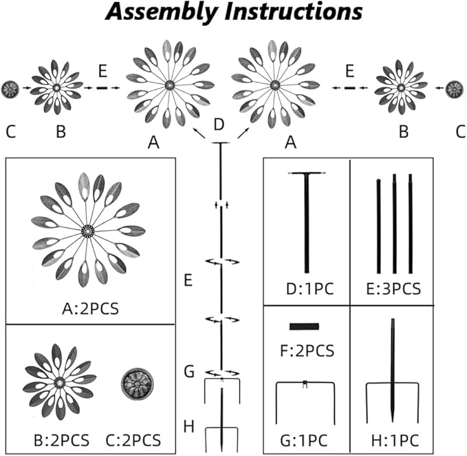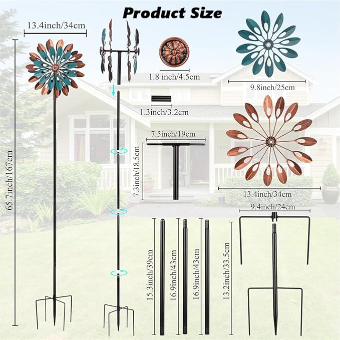 • Easy to Assemble: Our wind spinners for yard come in three simple parts: the blades, the poles, and the stable stake. Each part can be easily put together following the instructions, and no tools are required. Just stick it into soft ground and enjoy it