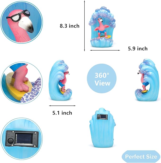 • 【HIGH QUALITY & HAND-PAINTED】This flamingo solar lights is hand made by durable long-lasting resin, highly-detailed and waterproof outside decorations for yard. tiki decor measures 5.9”Wx5.3”Dx8.3”H