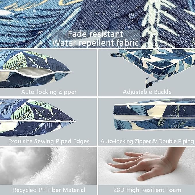 • ⭐Material: Made of 100% durable polyester fabric and soft filling material. It’s water repellent and fade-resistant. Won’t fading under the direct sunlight over 500 hours. Cushions are filled with 28D high resilient foama, overstuffed construction for enhanced comfort and longevity.